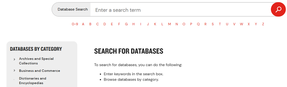 La Trobe University Library's Browse Databases page lists all of the databases available at La Trobe. In the left menu you will see Databases By Category. If you aren’t sure which databases to search, have a look at what is suggested for your subject area. If you know which database you are looking for, you can use the A-Z menu to navigate to it, or you can type the name into the search bar to search for it.