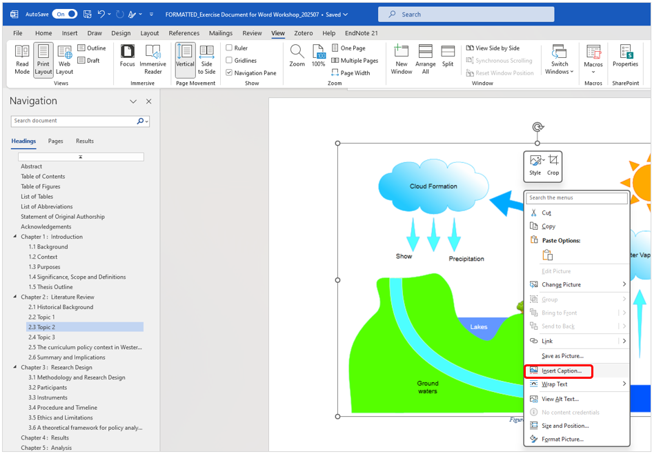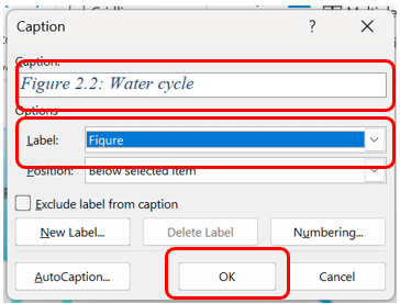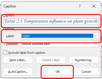 Word allows for a consistent way to insert captions above or below tables, figures, diagrams or images. You can also use the Insert Caption function to generate a Table of Figures and a List of Tables in your document.