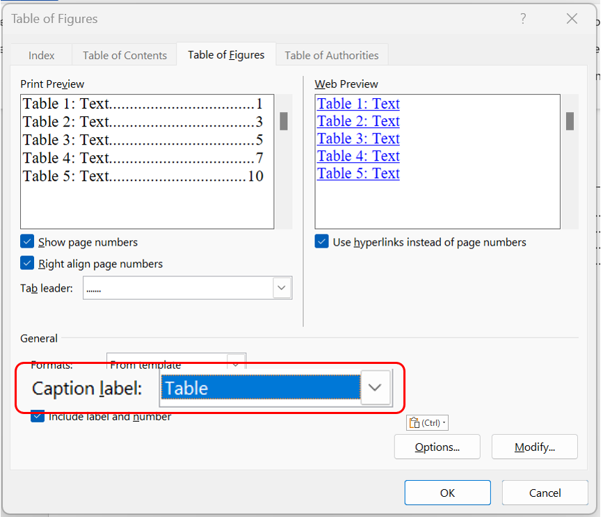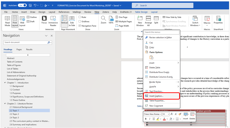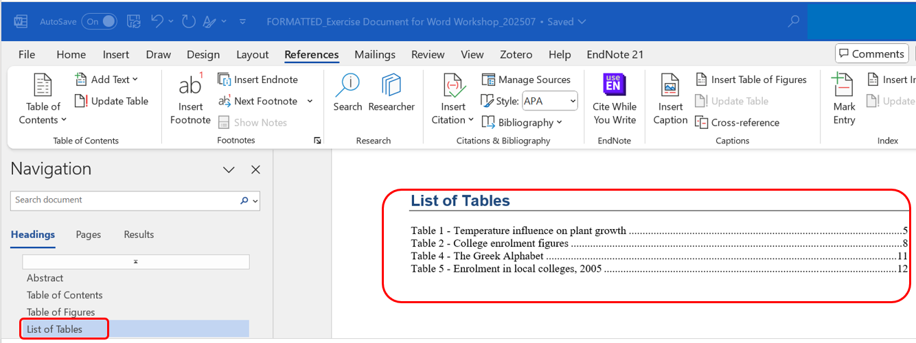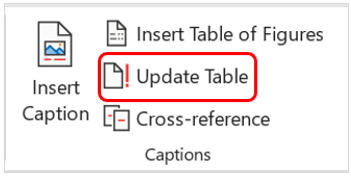 Once you've used the Insert Caption function as described above, you can now create a List of Tables.