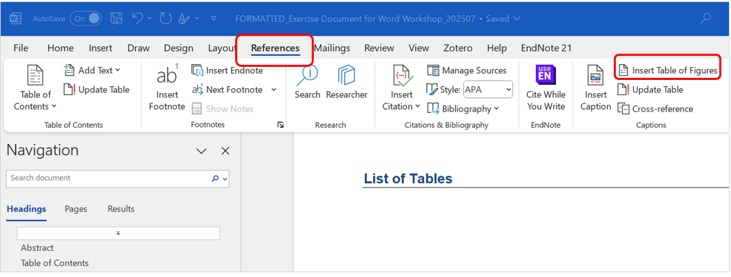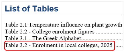 - Navigate to the place where you want the List of Tables to appear in your document.