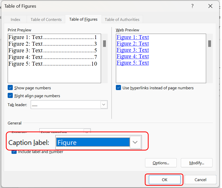 Once you've used the Insert Caption function as described above, you can now create a Table of Figures: